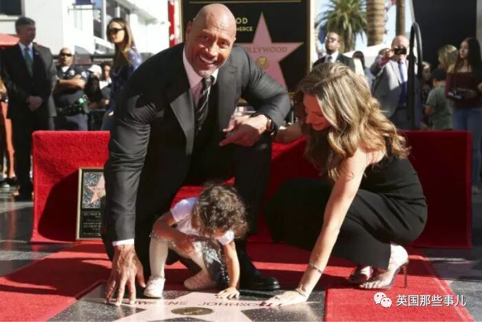 Lauren怀孕期间,带着女儿Jasmine陪同强森出席好莱坞星光大道的留名仪式,
