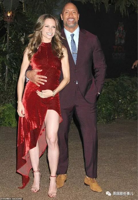 同一天,怀孕的Lauren身穿一身红裙,陪强森一起踏上电影的洛杉矶首映礼红毯,