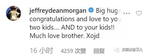 演员Jeffrey Dean Morgan:“超级恭喜,爱你们俩。也爱你们的孩子!非常爱你兄弟。”