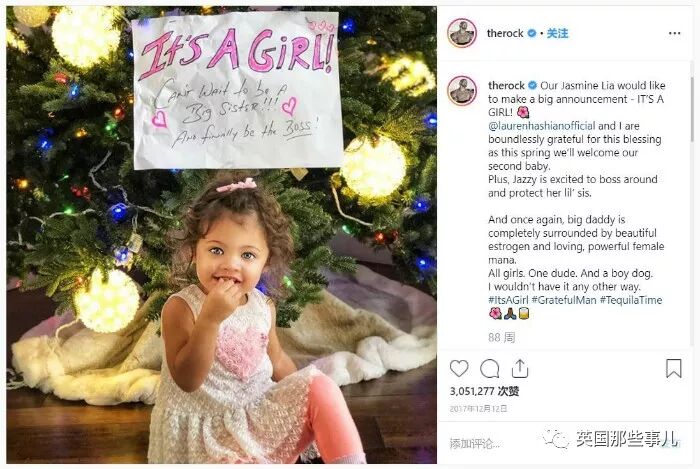 强森挑选了一个特殊的日子,也就是电影首映的那一天,在ins上发布了第三次当爸爸的喜讯,