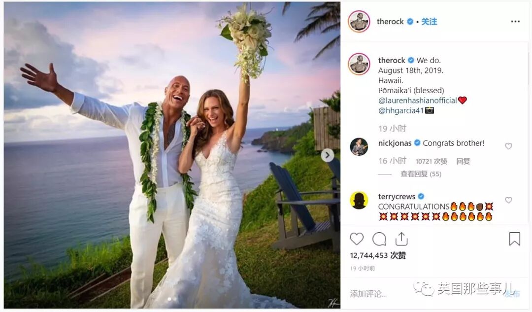 婚讯曝光后,不但让粉丝们激动了一把,很多明星朋友也第一时间在强森的ins留言,对他们表达祝福。