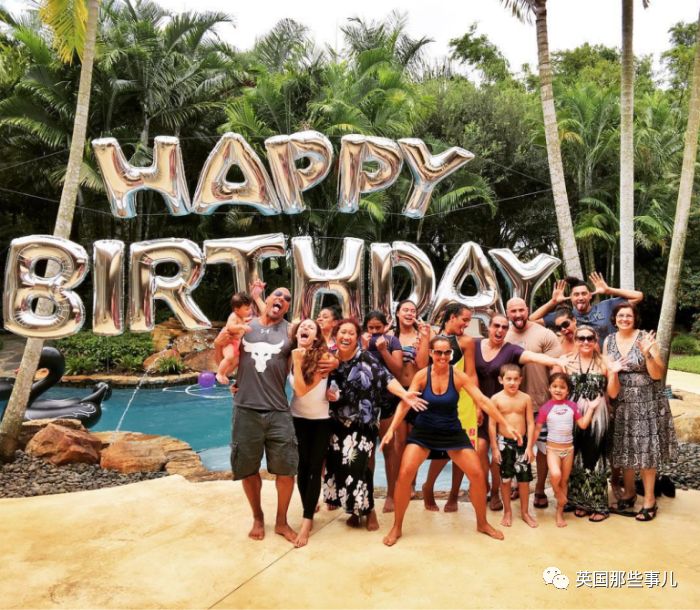 强森生日,妻子和两个女儿帮他准备了生日蛋糕,两个女儿坐在他膝头,感觉这才是人生赢家。