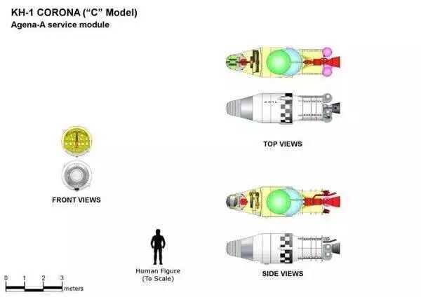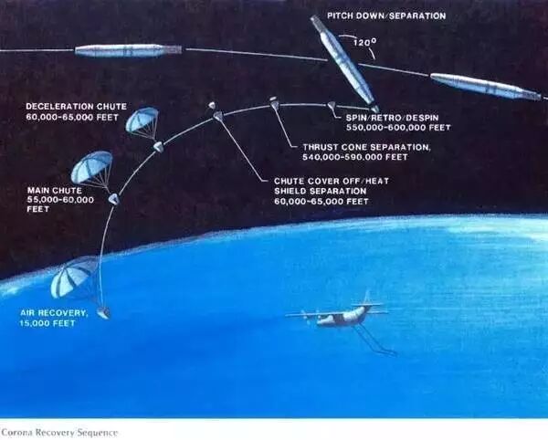 简而言之,“日冕”卫星搭载的摄像器材不是什么让人讶异的设备。最初,这些照相机只能解析距轨道1609多米远直径为12.2米左右的地面图像(与国际空间站相同),但后几代“日冕”卫星可以看到直径为1.524米的物体 ,这几乎可以与今天的卫星相当。但当时的问题在于如何返回珍贵的摄像情报(大多为中国和苏联的项目)。解决的方法是为每架照相机抛下两个返回舱(被称为“胶片桶”)。每台照相机配备了一个防热罩,会在“胶片桶”到达约18.2千米后掉落,此时会部署降落伞。“胶片桶”将继续下降到离地面4.57千米左右,再由一架飞机飞过将返回舱拖回飞机货舱。正如预期,这种回收计划并不总是奏效。1964年,返回舱落到委内瑞拉一个小山村,被当地农民拾获,这一情况使美国空军停止在返回舱上标记 “机密”字样,而是用8种语言写下将太空舱返回给美国的通知。