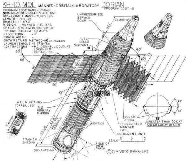 其实说到这里有人会好奇了,按照KH系列的命名逻辑,上一款光学间谍卫星是KH-9,下一款应为KH-10,为何直接跳到了KH-11?其实KH-10是确实存在过的间谍卫星计划,代号“多利安”。原计划KH-10将会是首款载人间谍卫星,其前部安装有类似于双子座飞船的载具,入轨后可与载人飞船对接,由宇航员负责回收和更换胶卷,以此来延长间谍卫星的任务时间。