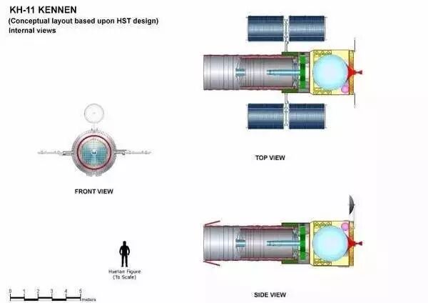 没有了返回载具占空间,KH-11比KH-9短了许多,重新设计的大面积太阳能电池板移到了卫星两侧为卫星提供更多电力,1990年发射的哈勃太空望远镜也参考了此设计。而作为间谍卫星的核心,增粗的KH-11内部安装有直径2.34米的第一级镜片,后续的KH-11将此直径进一步增大至3.1米。在最佳大气条件下采用2.4米镜片的KH-11的理论地面分辨率能达到15厘米,后续卫星除了进一步提高分辨率以外,还提高了镜片所能反射的电磁光谱,使得KH-11具备一定程度的远红外监视能力。