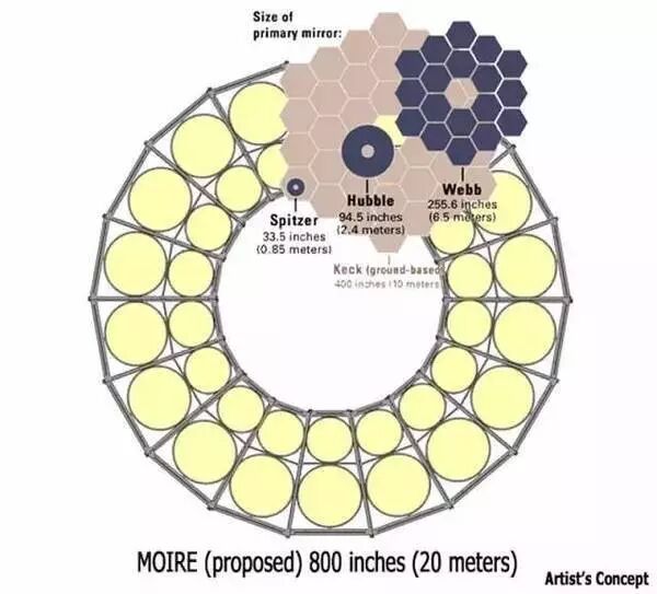 ▲MOIRE间谍卫星第一级反射镜和哈勃(Hubble),韦伯(Webb)太空望远镜第一级反射镜大小对比,韦伯已经耗资80亿美金,NRO的下一代KH请自行想象。