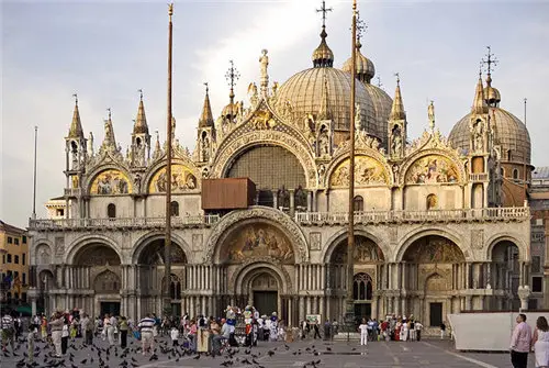 圣马可大教堂,即“圣马尔谷圣殿宗主教座堂”,位于圣马可广场东侧,是世界上最著名的教堂之一,建筑主要采用拜占庭风格,同时拥有其他各式风格的装饰。教堂上方有5个球形拱顶,立面上拥有精美的马赛克镶嵌画。里面的金屋、珍宝馆、博物馆等藏品各异,值得仔细参观。