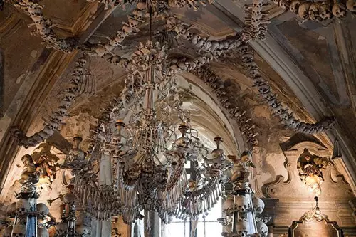 施瓦岑贝格家族在1870年买下了Sedlec修道院,他们让当地的一位木匠用40000人的骨骼进行创作,这些骨骼来自瘟疫期间无处埋葬的死者,它们在这儿的地下室里存在了几个世纪之久。头骨和大腿骨在圆顶天花板上穿成一行,就像是恐怖的圣诞节装饰品,中央的吊灯里至少包含了人类身体的每块骨头。在小礼拜堂的角落里堆积着四个庞大的骨头金字塔,还有用骨头十字架装饰的祭坛,甚至还有一件用骨头做的施瓦岑贝格家族的族徽。